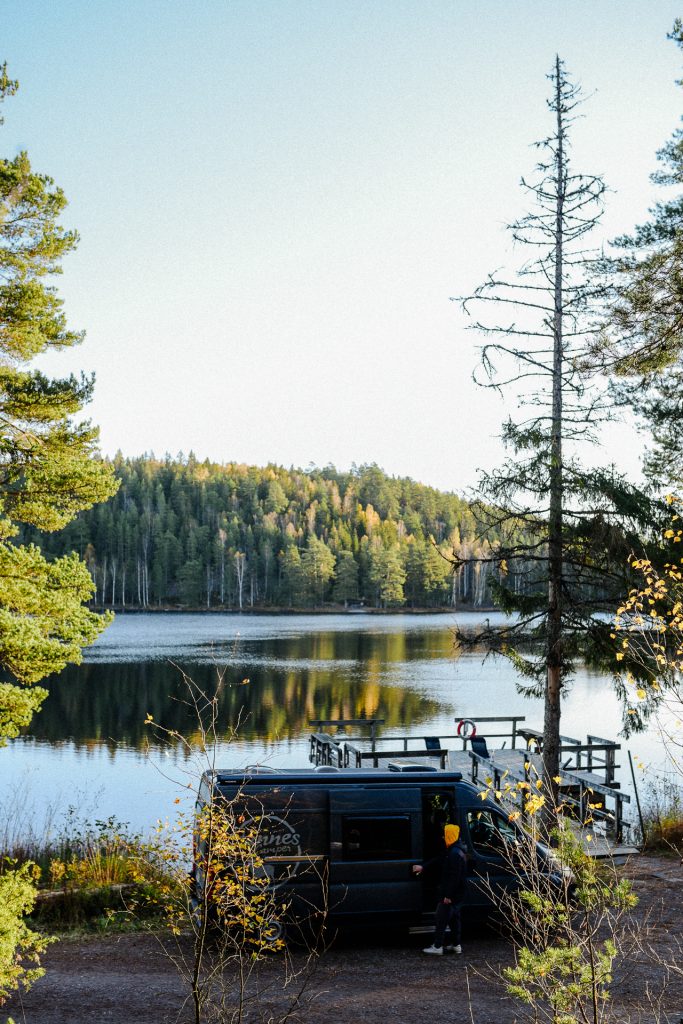 Bei der täglichen Stellplatzsuche helfen verschiedenste Apps gut, aber auch ein bisschen Gespür und eingehendes Studieren von Google Maps – Schweden ist so riesig und an vielen Stellen dermaßen dünn besiedelt, dass einige Waldwege eben nicht auf einem bewohnten Grundstück, sondern an einer öffentlichen Badestelle oder ganz einfach in einer Kehre mitten im Wald enden. Fast jeder schöne Platz hat auch eine Feuerstelle, häufig in Kombination mit Sitzgelegenheiten und Windfang. Das Grillen über offenem Feuer musste natürlich sein und der Gemütlichkeitsfaktor steigt sowieso enorm.