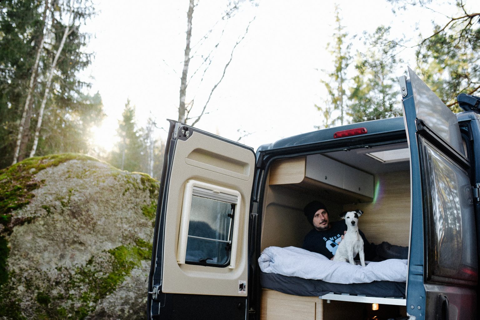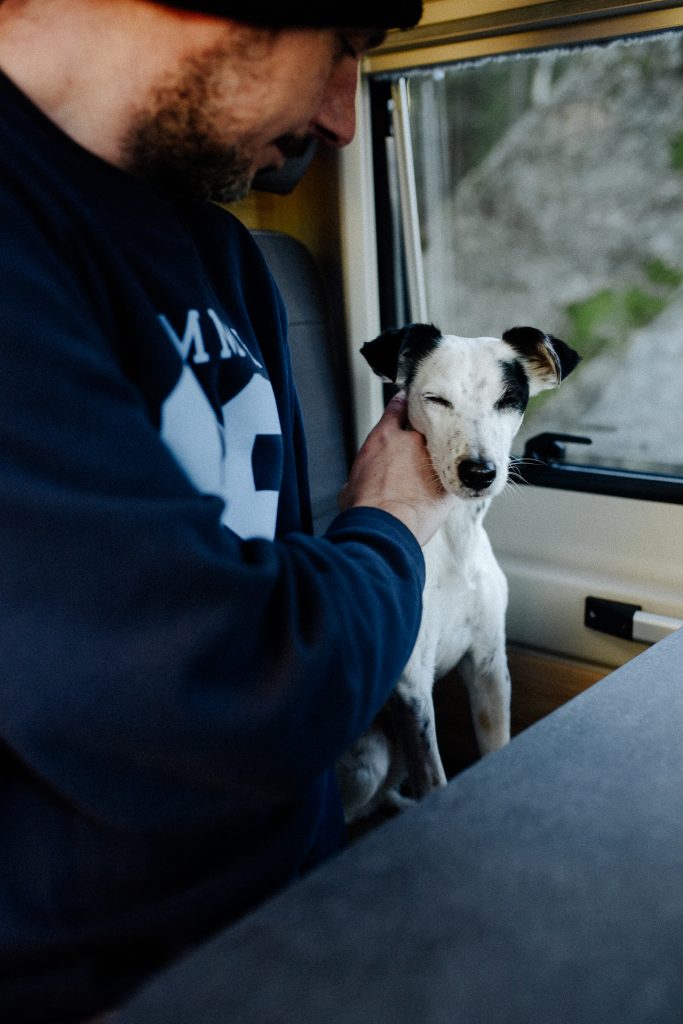 Doch vorerst erwartete uns das, was wir uns unter Camper-Urlaub vorstellen: Das Übernachten in freier Wildbahn. Zugegeben, die ersten Nächte sind noch etwas unruhig, insbesondere dann, wenn es rundherum wirklich stockduster und totenstill ist. Gezielt gesetzte Spots im Camper machen aber sofort eine gemütliche Atmosphäre und das Beste: Wenn das Licht aus ist, funkeln die Sterne durch das Dachfenster direkt aufs Bett. Das fand sogar Guti so gut, dass sie sich einen Platz im Bett erkämpft hat. Na ja, ist ja schließlich Urlaub…
